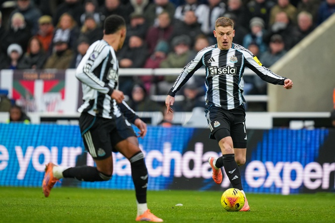 Harvey Barnes of Newcastle United runs with the ball during the Premier League match Newcastle United vs Chelsea at St. James's Park, Newcastle, United Kingdom, 20th December 2025, Credit:Maynard Manyowa/News Images / Avalon