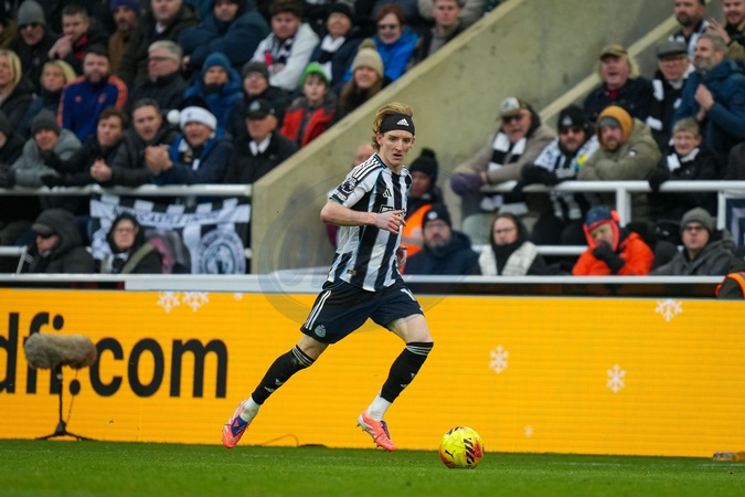 Anthony Gordon of Newcastle United runs with the ball on the wing during the Premier League match Newcastle United vs Chelsea at St. James's Park, Newcastle, United Kingdom, 20th December 2025, Credit:Maynard Manyowa/News Images / Avalon
