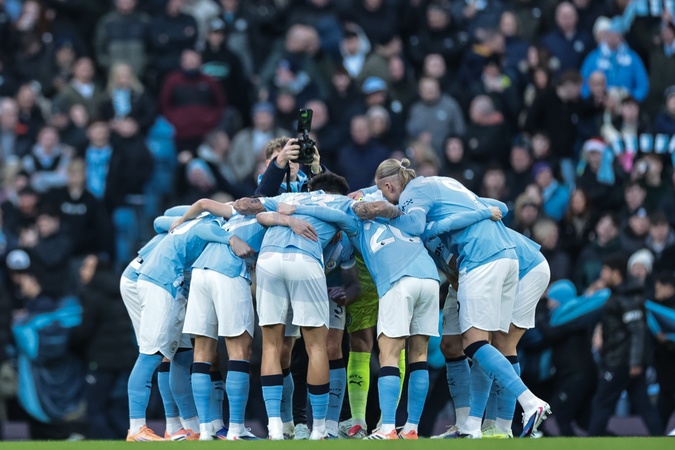 Manchester City tam huddle during the Premier League match Manchester City vs West Ham United at Etihad Stadium, Manchester, United Kingdom, 20th December 2025, Credit:Mark Cosgrove/News Images / Avalon