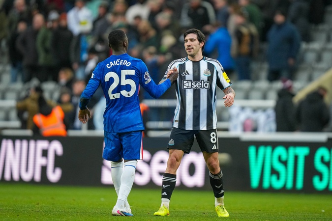 Moises Caicedo of Chelsea and Sandro Tonali of Newcastle United exchange handshakes and a hug at full time during the Premier League match Newcastle United vs Chelsea at St. James's Park, Newcastle, United Kingdom, 20th December 2025, Credit:Maynard Manyowa/News Images / Avalon