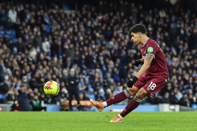 Mateus Fernandes of West Ham United shoots on goal during the Premier League match Manchester City vs West Ham United at Etihad Stadium, Manchester, United Kingdom, 20th December 2025, Credit:Mark Cosgrove/News Images / Avalon