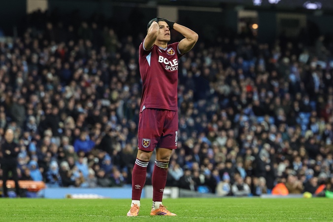 Mateus Fernandes of West Ham United reacts after a missed chance on goal during the Premier League match Manchester City vs West Ham United at Etihad Stadium, Manchester, United Kingdom, 20th December 2025, Credit:Mark Cosgrove/News Images / Avalon