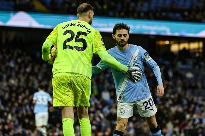 Manchester City goalkeeper Gianluigi Donnarumma and Bernardo Silva of Manchester City pat each other after stopping a West Hams chance on goal during the Premier League match Manchester City vs West Ham United at Etihad Stadium, Manchester, United Kingdom, 20th December 2025, Credit:Mark Cosgrove/News Images / Avalon