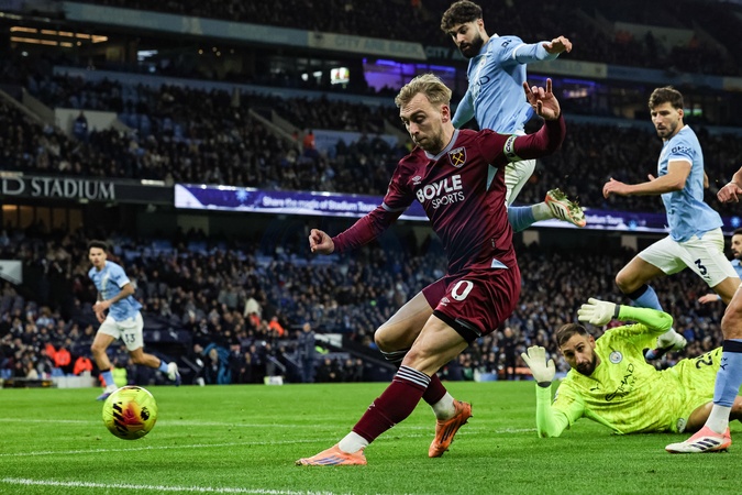 Jarrod Bowen of West Ham United shoots on goal and hits the side netting during the Premier League match Manchester City vs West Ham United at Etihad Stadium, Manchester, United Kingdom, 20th December 2025, Credit:Mark Cosgrove/News Images / Avalon
