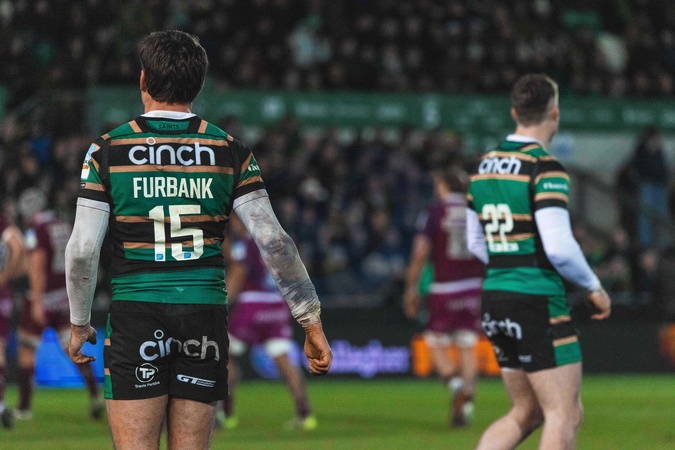 George Furbank of Northampton Saints and Tommy Freeman of Northampton Saints during the Gallagher Premiership match Northampton Saints vs Sale Sharks at Cinch Stadium at Franklin's Gardens, Northampton, United Kingdom, 20th December 2025, Credit:Craig Evans/News Images / Avalon