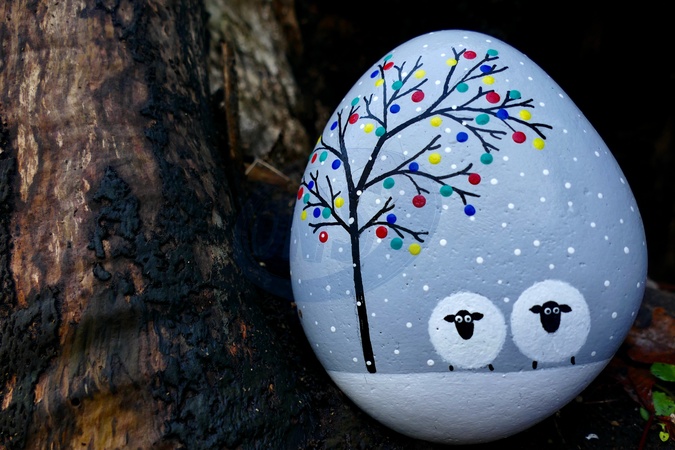 A rock painted with a seasonal scene is left in a tree trunk for a passer by to take., Credit:Geoffrey Swaine / Avalon