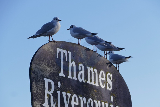 Little gulls perch on a sign by The River Thames in the sunshine., Credit:Geoffrey Swaine / Avalon