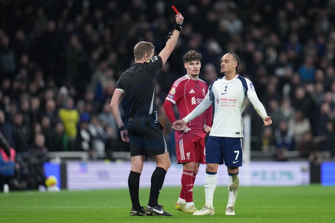 Xavi Simons of Tottenham Hotspur shown red after var decision during the Premier League match Tottenham Hotspur vs Liverpool at Tottenham Hotspur Stadium, London, United Kingdom, 20th December 2025, Credit:Harvey Murphy/News Images / Avalon