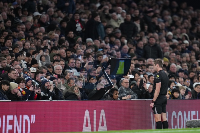 Referee John Brooks goes over to var monitor for potential red card during the Premier League match Tottenham Hotspur vs Liverpool at Tottenham Hotspur Stadium, London, United Kingdom, 20th December 2025, Credit:Harvey Murphy/News Images / Avalon