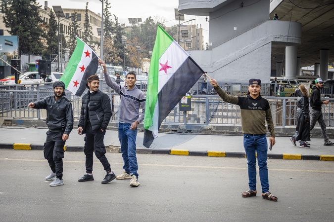 Syrians gathered in central Damascus on December 8, 2025, to take part in what was described as a "Liberation Celebration.” Large crowds waved Syrian flags, filled public squares, and chanted slogans marking the occasion. The celebrations continued throughout the day, with participants expressing national pride, unity, and hope during the commemorative events in the capital., Credit:Zak Irfan / Avalon