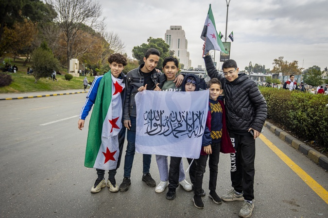 Syrians gathered in central Damascus on December 8, 2025, to take part in what was described as a "Liberation Celebration.” Large crowds waved Syrian flags, filled public squares, and chanted slogans marking the occasion. The celebrations continued throughout the day, with participants expressing national pride, unity, and hope during the commemorative events in the capital., Credit:Zak Irfan / Avalon