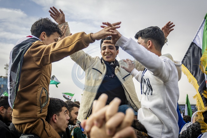 Syrians gathered in central Damascus on December 8, 2025, to take part in what was described as a "Liberation Celebration.” Large crowds waved Syrian flags, filled public squares, and chanted slogans marking the occasion. The celebrations continued throughout the day, with participants expressing national pride, unity, and hope during the commemorative events in the capital., Credit:Zak Irfan / Avalon