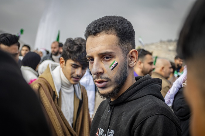 Syrians gathered in central Damascus on December 8, 2025, to take part in what was described as a "Liberation Celebration.” Large crowds waved Syrian flags, filled public squares, and chanted slogans marking the occasion. The celebrations continued throughout the day, with participants expressing national pride, unity, and hope during the commemorative events in the capital., Credit:Zak Irfan / Avalon