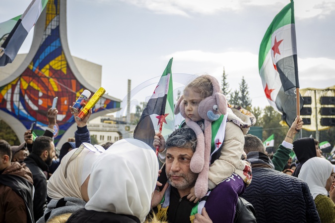 Syrians gathered in central Damascus on December 8, 2025, to take part in what was described as a "Liberation Celebration.” Large crowds waved Syrian flags, filled public squares, and chanted slogans marking the occasion. The celebrations continued throughout the day, with participants expressing national pride, unity, and hope during the commemorative events in the capital., Credit:Zak Irfan / Avalon