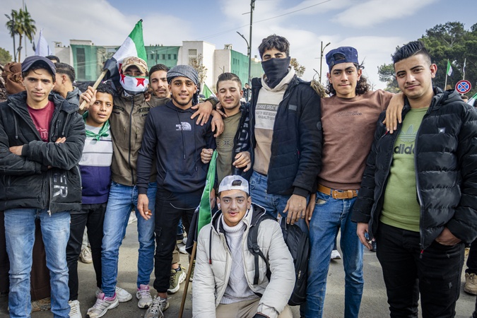 Syrians gathered in central Damascus on December 8, 2025, to take part in what was described as a "Liberation Celebration.” Large crowds waved Syrian flags, filled public squares, and chanted slogans marking the occasion. The celebrations continued throughout the day, with participants expressing national pride, unity, and hope during the commemorative events in the capital., Credit:Zak Irfan / Avalon