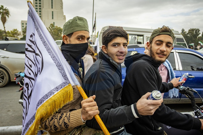 Syrians gathered in central Damascus on December 8, 2025, to take part in what was described as a "Liberation Celebration.” Large crowds waved Syrian flags, filled public squares, and chanted slogans marking the occasion. The celebrations continued throughout the day, with participants expressing national pride, unity, and hope during the commemorative events in the capital., Credit:Zak Irfan / Avalon