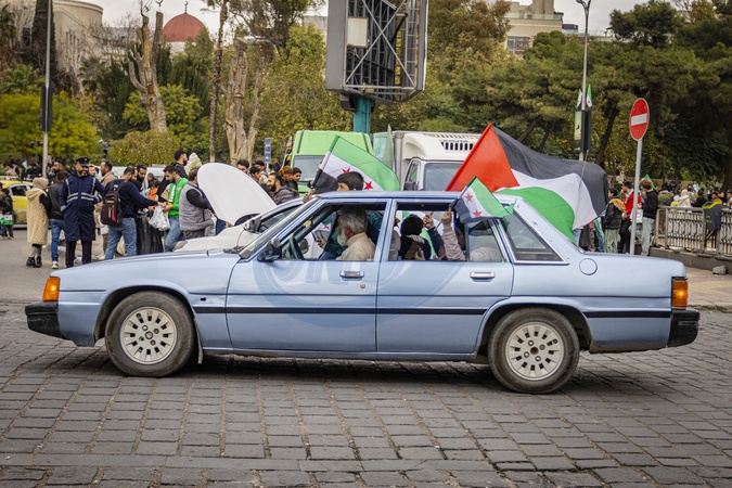 Syrians gathered in central Damascus on December 8, 2025, to take part in what was described as a "Liberation Celebration.” Large crowds waved Syrian flags, filled public squares, and chanted slogans marking the occasion. The celebrations continued throughout the day, with participants expressing national pride, unity, and hope during the commemorative events in the capital., Credit:Zak Irfan / Avalon