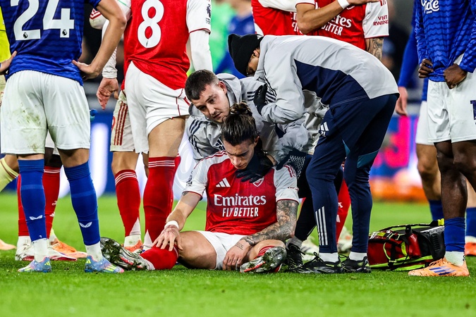 Riccardo Calafiori of Arsenal receives treatment during the Premier League match Everton vs Arsenal at Hill Dickinson Stadium, Liverpool, United Kingdom, 20th December 2025, Credit:Ae Cosgrove/News Images / Avalon