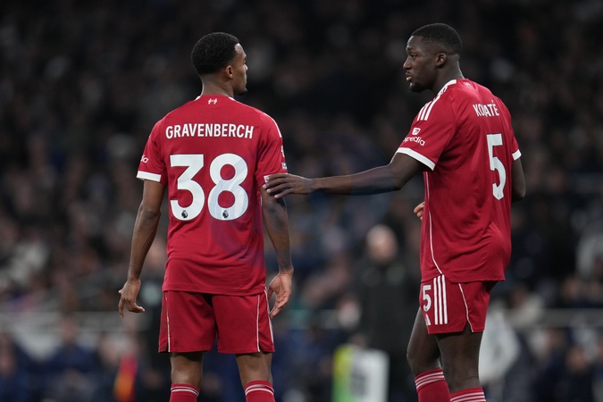 Ryan Gravenberch of Liverpool and Ibrahima Konaté of Liverpool during the Premier League match Tottenham Hotspur vs Liverpool at Tottenham Hotspur Stadium, London, United Kingdom, 20th December 2025, Credit:Harvey Murphy/News Images / Avalon