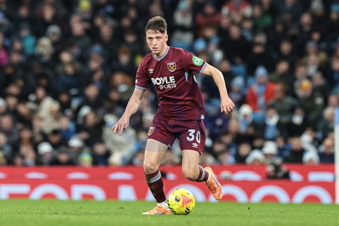 Oliver Scarles of West Ham United breaks with the ball during the Premier League match Manchester City vs West Ham United at Etihad Stadium, Manchester, United Kingdom, 20th December 2025, Credit:Mark Cosgrove/News Images / Avalon