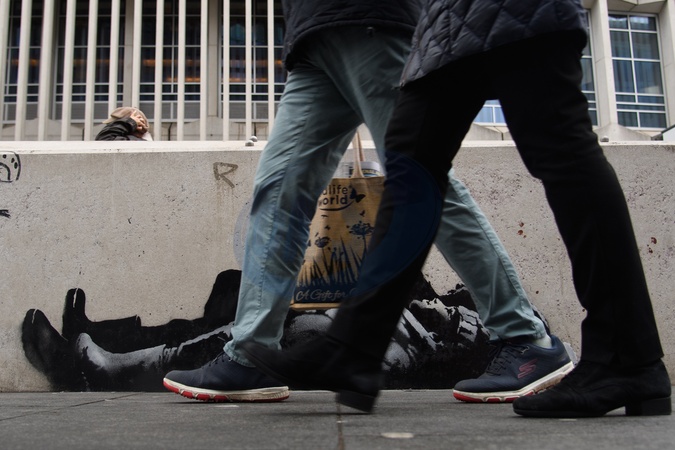 A suspected Banksy artwork depicting children pointing up at the sky has appeared on Tottenham Court Road, London, England, UK on Sunday 21 December, 2025 with the Centre Point skyscraper tower in the background, a potential reference to the skyscraper's history of being an empty skyscraper for the rich that could have housed homeless people and to the homeless charity Centrepoint which was founded in protest at Centre Point., Credit:Justin Ng / Avalon
