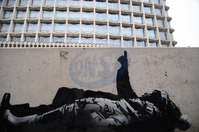 A suspected Banksy artwork depicting children pointing up at the sky has appeared on Tottenham Court Road, London, England, UK on Sunday 21 December, 2025 with the Centre Point skyscraper tower in the background, a potential reference to the skyscraper's history of being an empty skyscraper for the rich that could have housed homeless people and to the homeless charity Centrepoint which was founded in protest at Centre Point., Credit:Justin Ng / Avalon