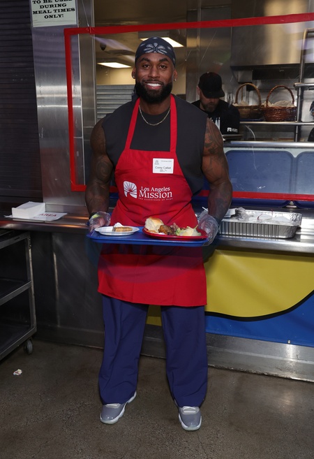 Corey Calliet takes part in the Los Angeles Mission's Annual Thanksgiving Outreach on Skid Row, Los Angeles, USA, 19 December 2025., Credit:Faye Sadou / Avalon
