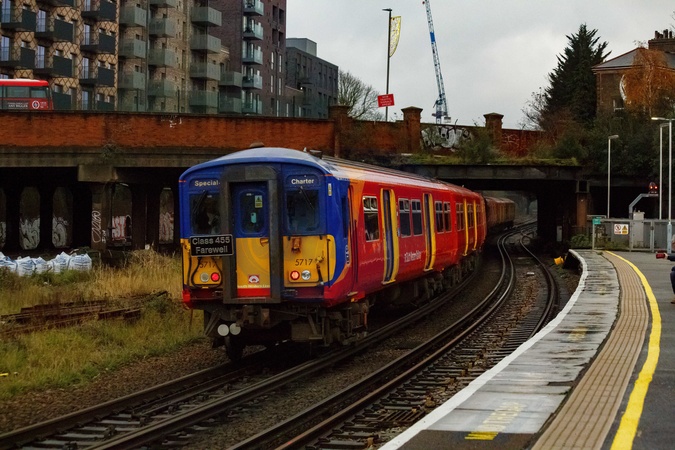 After 42 years, the class 455 farewell tour features south western workhorses that have served London Waterloo commuters till the very end in great reliability. They have won a remarkable total of 13 Golden Spanners awards for reliability to prove it. Built by British Rail Engineering Limited at their workshop in York between 1982 and 1985, the trains entered service on what is now SWR's suburban network on Monday, 28 March 1983. The units on the first train are class 455712+455717, and the second class is 455727+87. The farewell tour by Great British Railways/South Western Railway and the Branch Line Society is raising money for the Alex Wardle Foundation, Macmillan, and Railway Children. With tickers for the tour costing £45.50 having sold out in 15 seconds, London, UK, 21 December 2025, Credit:Alex Day / Avalon