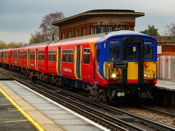 After 42 years, the class 455 farewell tour features south western workhorses that have served London Waterloo commuters till the very end in great reliability. They have won a remarkable total of 13 Golden Spanners awards for reliability to prove it. Built by British Rail Engineering Limited at their workshop in York between 1982 and 1985, the trains entered service on what is now SWR's suburban network on Monday, 28 March 1983. The units on the first train are class 455712+455717, and the second class is 455727+87. The farewell tour by Great British Railways/South Western Railway and the Branch Line Society is raising money for the Alex Wardle Foundation, Macmillan, and Railway Children. With tickers for the tour costing £45.50 having sold out in 15 seconds, London, UK, 21 December 2025, Credit:Alex Day / Avalon