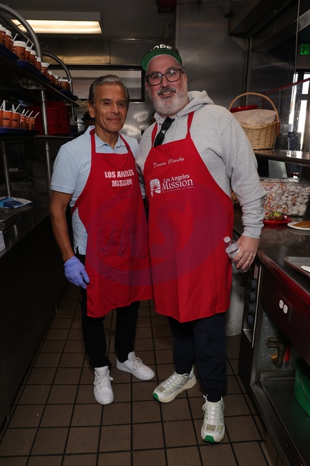 Antonio Villaraigosa and Dennis Oleesky takes part in the Los Angeles Mission's Annual Thanksgiving Outreach on Skid Row, Los Angeles, USA, 19 December 2025., Credit:Faye Sadou / Avalon