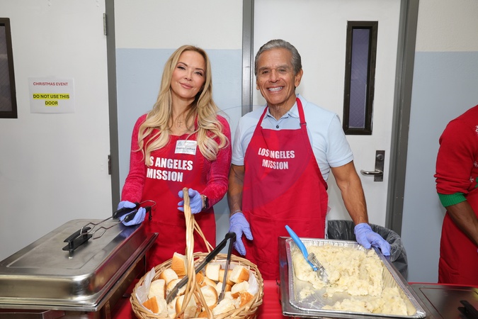 Brandy Ledford and Antonio Villaraigosa take part in the Los Angeles Mission's Annual Thanksgiving Outreach on Skid Row, Los Angeles, USA, 19 December 2025, Credit:Faye Sadou / Avalon