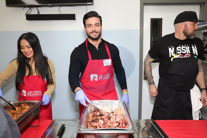 Iris Au and Davide Sanclimenti take part in the Los Angeles Mission's Annual Thanksgiving Outreach on Skid Row, Los Angeles, USA, 19 December 2025., Credit:Faye Sadou / Avalon