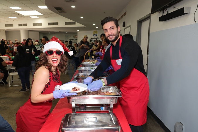 Christina DeRosa and Davide Sanclimenti takes part in the Los Angeles Mission's Annual Thanksgiving Outreach on Skid Row, Los Angeles, USA, 19 December 2025., Credit:Faye Sadou / Avalon