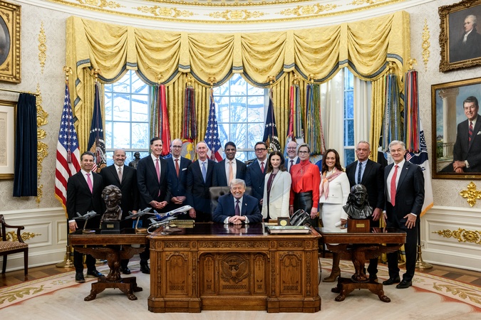 President Donald Trump poses for photos in the Oval Office after making an announcement on prescription drug prices, Friday, December 19, 2025., Credit:Joyce N. Boghosian / Avalon