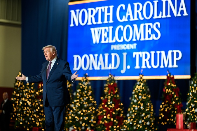 President Donald Trump arrives on stage to deliver remarks on the economy at the Rocky Mount Event Center in Rocky Mount, North Carolina on Friday, December 19, 2025., Credit:Daniel Torok / Avalon