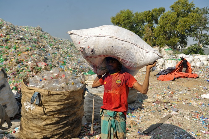 Chattogram, Bangladesh — Workers carry plastic bottle filled big sac over head at a recycling facility in Chattogram, a coastal city in southeastern Bangladesh that frequently faces the impacts of climate change, including flooding. For more than a decade, plastic waste collected from across the city has been processed here, playing a vital role in environmental protection. The recycled raw plastic materials are exported to countries including Turkey, Dubai, and the United States, highlighting both the severe global burden of plastic pollution and the importance of recycling within the circular economy., Credit:Md Rafayat Haque Khan / Avalon