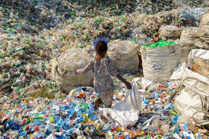 Chattogram, Bangladesh — Child girl worker in the discarded plastic bottles for recycling at a recycling facility in Chattogram, a coastal city in southeastern Bangladesh that frequently faces the impacts of climate change, including flooding. For more than a decade, plastic waste collected from across the city has been processed here, playing a vital role in environmental protection. The recycled raw plastic materials are exported to countries including Turkey, Dubai, and the United States, highlighting both the severe global burden of plastic pollution and the importance of recycling within the circular economy., Credit:Md Rafayat Haque Khan / Avalon
