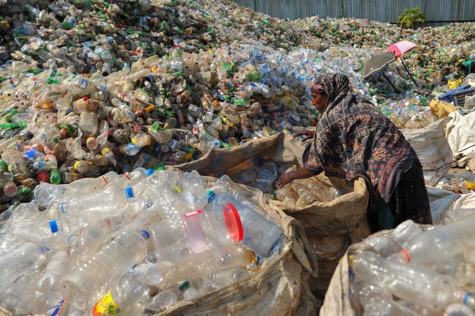 Chattogram, Bangladesh — Workers prepare discarded plastic bottles for recycling at a recycling facility in Chattogram, a coastal city in southeastern Bangladesh that frequently faces the impacts of climate change, including flooding. For more than a decade, plastic waste collected from across the city has been processed here, playing a vital role in environmental protection. The recycled raw plastic materials are exported to countries including Turkey, Dubai, and the United States, highlighting both the severe global burden of plastic pollution and the importance of recycling within the circular economy., Credit:Md Rafayat Haque Khan / Avalon