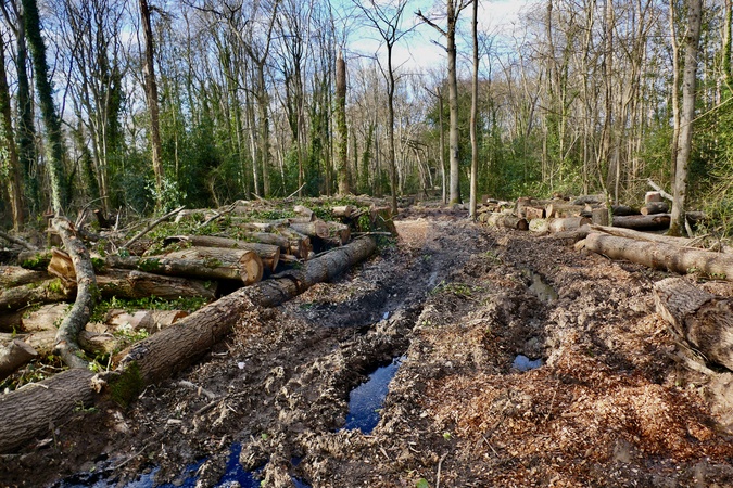 Country paths are being cleared and fallen ash tree logs are being used to create a new area for walkways and regrowth management after an outbreak of ash dieback in Clayfield Copse & Blackhouse Woods. Saplings are going to be planted to bring new life too old. Ash dieback disease was confirmed at Clayfield Copse at the start of the year, it is a popular local nature reserve in Reading. The fungal disease significantly weakens ash trees, making their branches and entire trunks brittle and prone to falling with little warning, posing a serious public safety risk., Credit:Geoffrey Swaine / Avalon