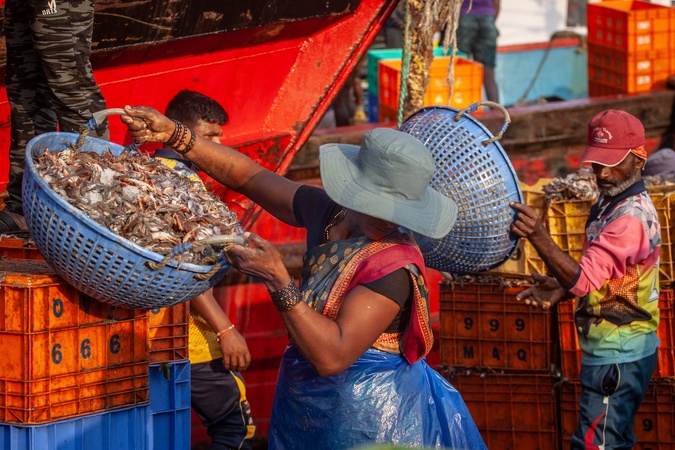 Fishermen and vendors gather during the early morning auction at the Bunder fish market in Mangalore, Karnataka, on December 13, 2025. The bustling riverside market is a primary hub for the Arabian Sea catch, serving as the central point for seafood distribution across South India., Credit:Yousuf Sarfaraz / Avalon