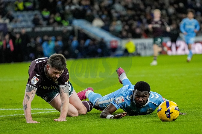 Ephron Mason-Clark, of Coventry City falls to the ground under a challenge from Cameron Burgess, of Swansea City during the Sky Bet Championship match Coventry City vs Swansea City at Coventry Building Society Arena, Coventry, United Kingdom, 26th December 2025, Credit:Maynard Manyowa/News Images / Avalon