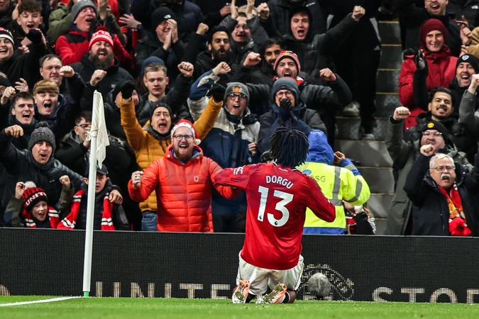 Patrick Dorgu of Manchester Untied celebrates his goal to make it 1-0 during the Premier League match Manchester United vs Newcastle United at Old Trafford, Manchester, United Kingdom, 26th December 2025, Credit:Ae Cosgrove/News Images / Avalon