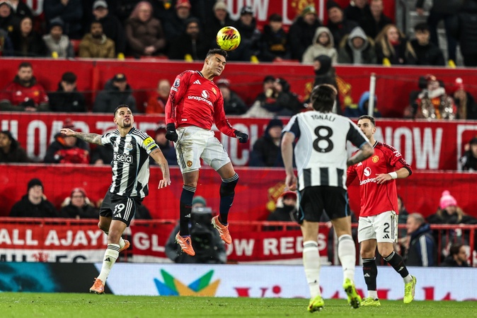 Casemiro of Manchester Untied jumps up to win the high ball during the Premier League match Manchester United vs Newcastle United at Old Trafford, Manchester, United Kingdom, 26th December 2025, Credit:Ae Cosgrove/News Images / Avalon