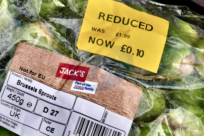 Baskets full of vegetables associated with a traditional Christmas dinner are reduced massively in a supermarket. Prior to the big day, festive shoppers were snapping up carrots, parsnips and Brussels sprouts for as little as 5p a packet, NFU Scotland says the bargains come at a cost to farmers and the value of food saying that the aggressive discounting risks devaluing domestic produce., Credit:Geoffrey Swaine / Avalon
