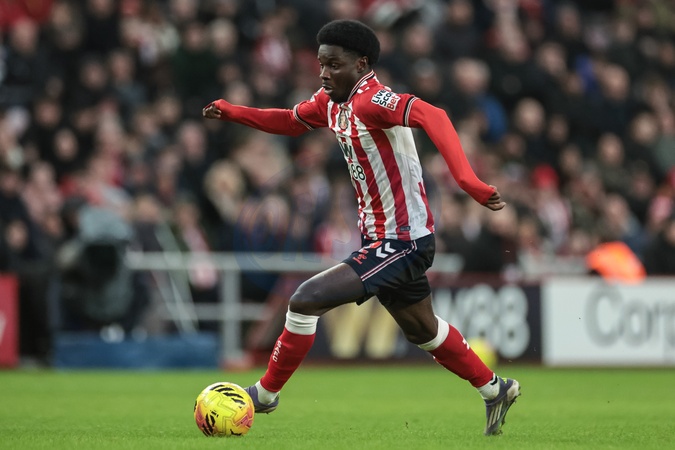 Eliezer Mayenda of Sunderland breaks with the ball during the Premier League match Sunderland vs Leeds United at Stadium Of Light, Sunderland, United Kingdom, 28th December 2025, Credit:Ae Cosgrove/News Images / Avalon