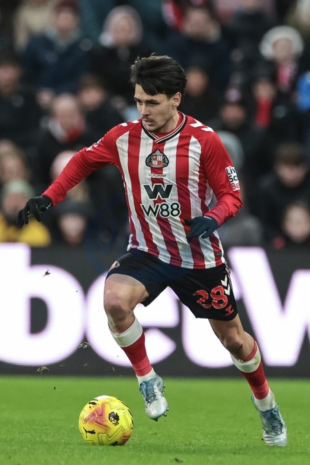Enzo Le Fee of Sunderland with the ball during the Premier League match Sunderland vs Leeds United at Stadium Of Light, Sunderland, United Kingdom, 28th December 2025, Credit:Ae Cosgrove/News Images / Avalon