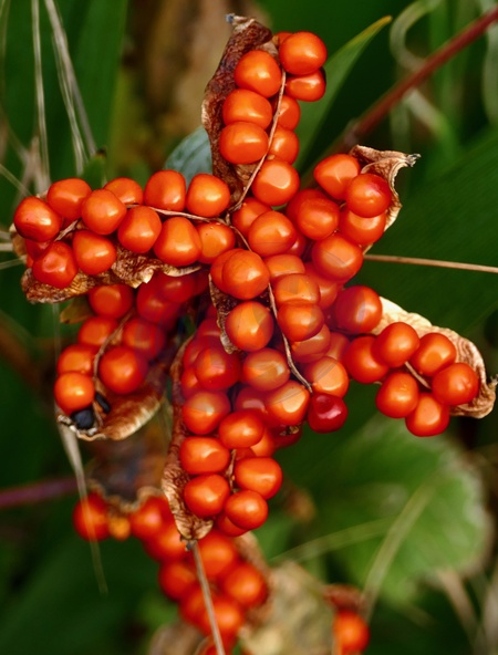Bright orange stinking iris berries on a wintery afternoon in the countryside., Credit:Geoffrey Swaine / Avalon