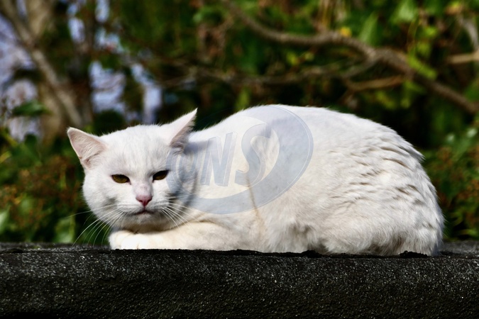A pure white cat sits on a shed roof in the sunshine., Credit:Geoffrey Swaine / Avalon