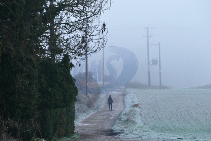 Walkers out on a cold, frosty and foggy morning in the countryside., Credit:Geoffrey Swaine / Avalon