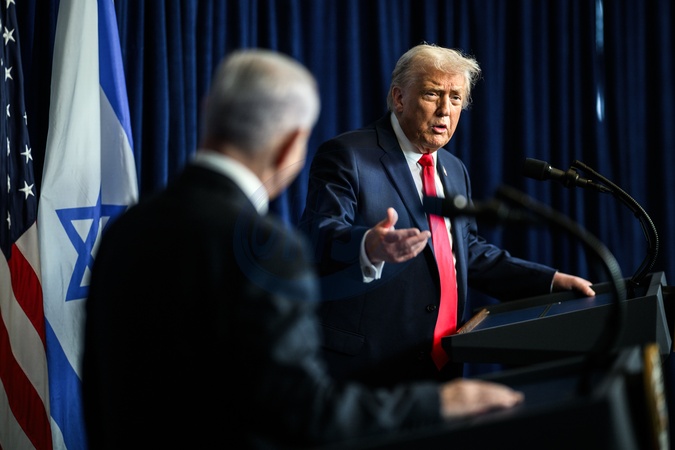 President Donald Trump participates in a bilateral press conference with Israeli Prime Minister Benjamin Netanyahu, Monday, December 29, 2025, at the Mar-a-Lago Club in Palm Beach, Florida., Credit:Daniel Torok / Avalon